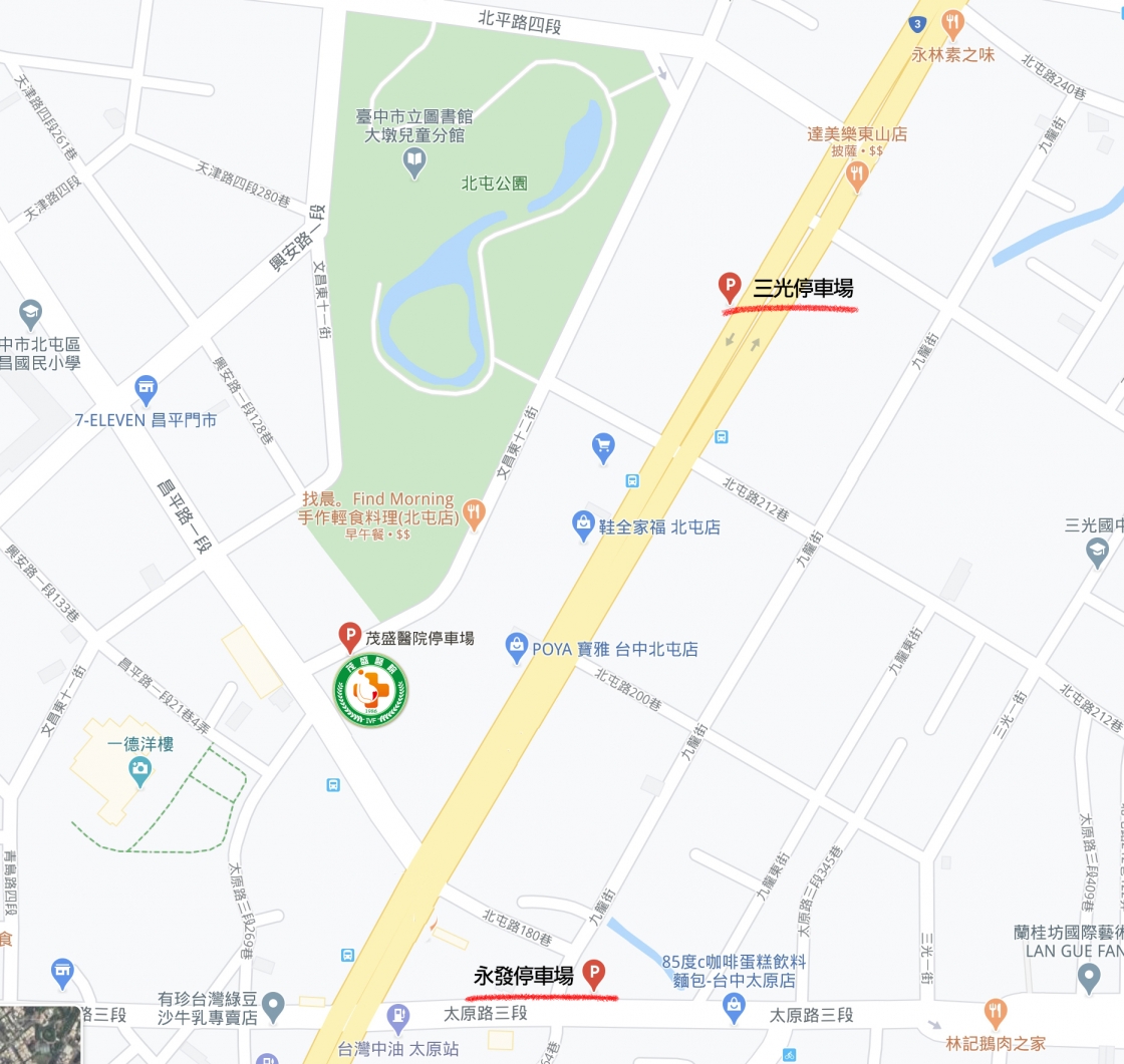 | ● 一德洋樓停車場:台中市北屯區舊街二巷69號 ● 三光停車場:台中市北屯區北屯路、北平路四段口 ● 永發停車場:台中市北屯區太原路三段、九龍街口 ● 九龍東街停車場:台中市北屯區九龍東街35號旁 |
