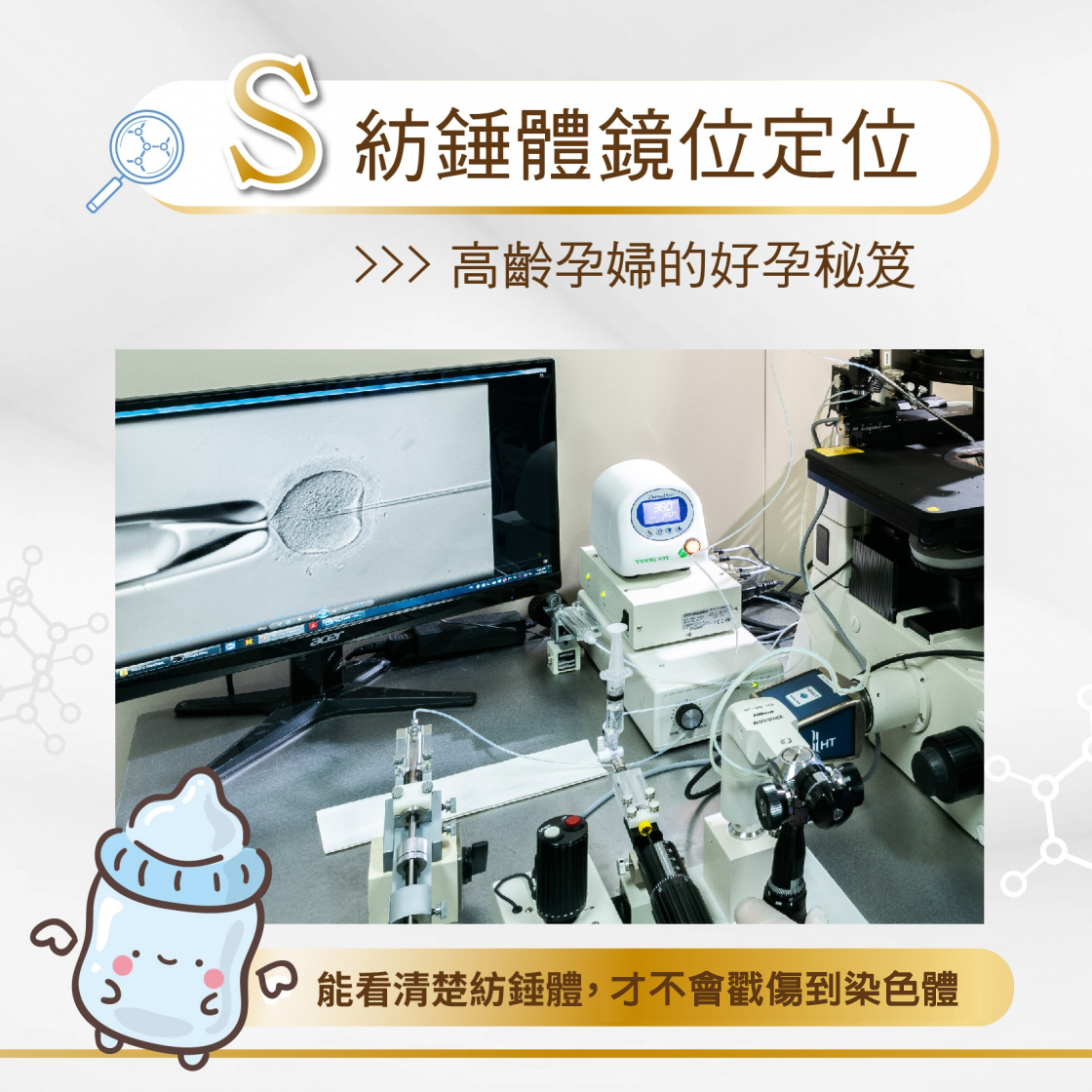 隨著年齡增長,紡錘體(spindle)發生位置偏移的機率也會隨之增加。進行精蟲顯微注射時,運用紡錘體定位技術,巧妙避開紡錘體,,避免於精子顯微注射時造成紡錘體上的染色體之傷害並順利達到受精的目的。