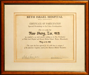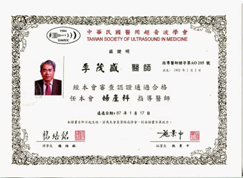 | 專業認證 | 中華民國周產期醫學會胎兒頸部透明認證合格證 台灣周產期醫學會 - 專科醫師證書 台灣婦女泌尿暨骨盆重建專科醫師證書 台灣婦產科內視鏡暨微創醫學會 - 專科醫師證書 醫用超音波學會婦產科指導醫師 國際外科學院 - Fellow 教育部核可教授證書 Beth Israel Hospital - 試管嬰兒工作營 |