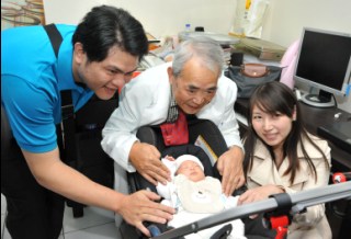 使用新型長效排卵針誕生的試管嬰兒家庭和李茂盛醫師合照