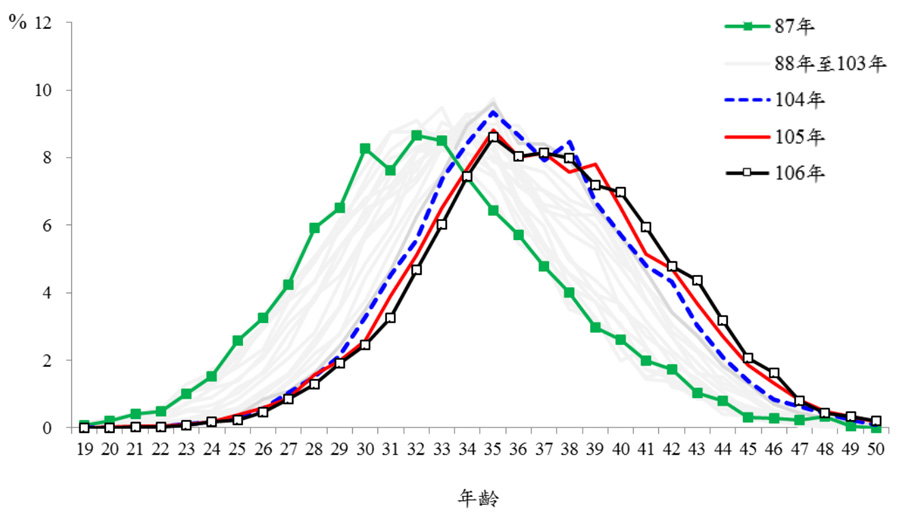 圖:87年至106年人工生殖受術妻之年齡百分比分佈(來源):衛福部國健署