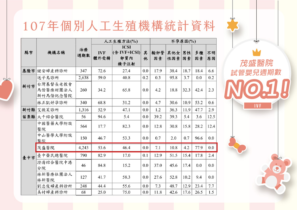 茂盛醫院院長李茂盛教授表示,茂盛醫院生殖醫學中心今年(2020年)蟬聯國健署人工生殖治療週期數第一名,在台灣每三個試管嬰兒,就有一位來自茂盛。