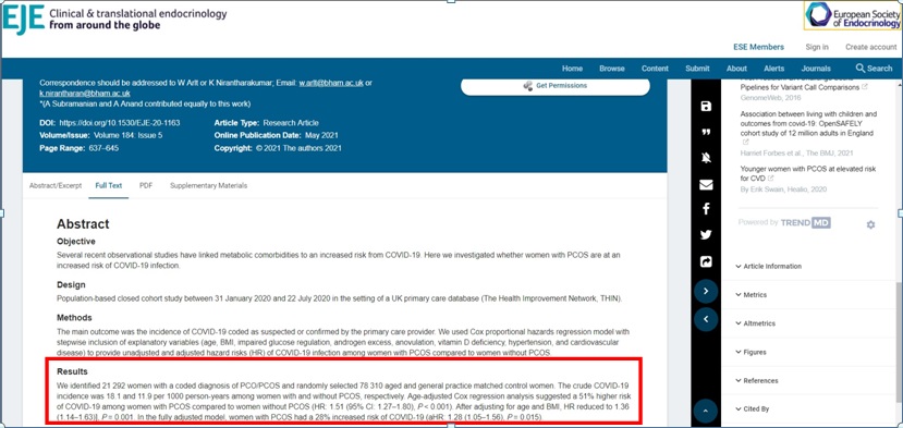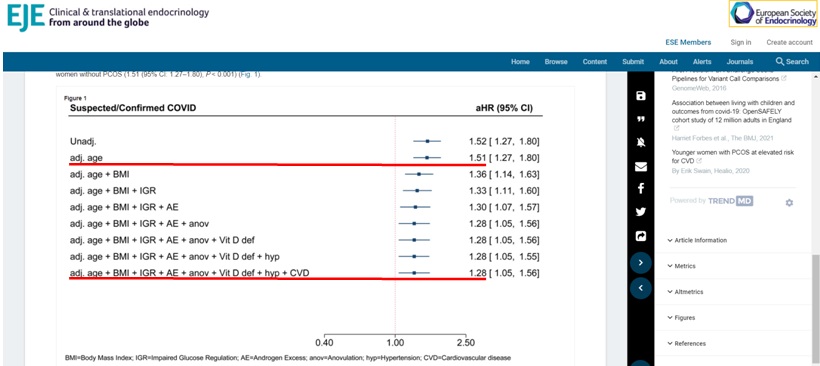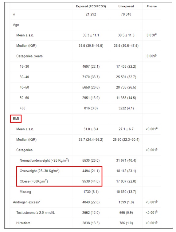 因多囊性卵巢(PCOS)為多種複雜的因素所導致,包含:年齡、BM I (身體質量指數)、葡萄糖調節受損、雄激素過多、無排卵、維生素 D 缺乏、高血壓和心血管疾病…等。該研究在去除BMI的變項之後,患有PCOS婦女其染疫的風險從51%降至28%。(21.1%多囊婦女的BMI介在25-30之間,醫學定義乃屬過重;另有44.8%的BMI大於30,即屬肥胖;兩者加總後,近六成六的英國婦女體重乃嚴重超標!)該研究結論提醒患有PCOS的婦女在疫情期間要務必做好防疫工作。