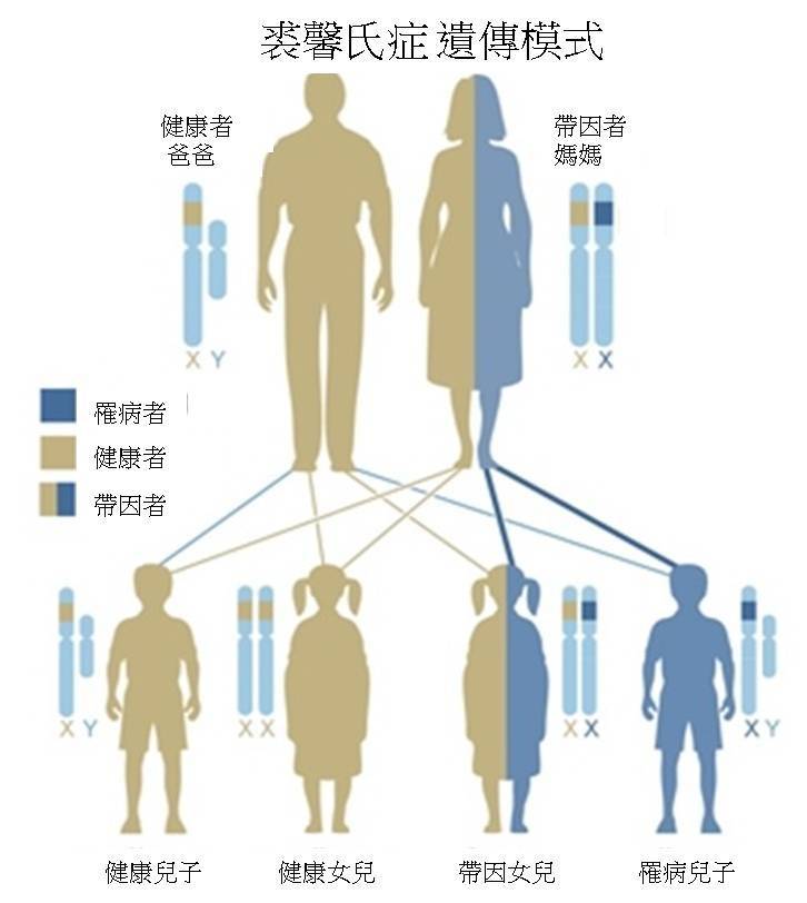 「裘馨症」是一種X染色體性聯隱性遺傳的進行性肌肉萎縮症。如母親是帶因者,父親是正常,兒子有1/2機率得到帶有缺陷的X染色體,因而罹患此症;同樣的,女兒也有1/2機率得到帶有缺陷的X染色體,但女兒因擁有2個X染色體(一條正常,一條帶有缺陷的X染色體),所以不會發病,為帶因者。但帶因者女兒,將來可能會將缺陷基因繼續遺傳給下一代。