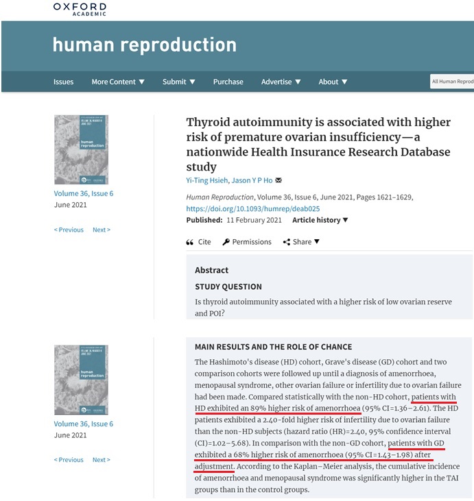 茂盛醫院家醫科呂昀珊醫師引據英國歐洲生殖醫學會上的一篇研究「Thyroid autoimmunity is associated with higher risk of premature ovarian insufficiency—a nationwide Health Insurance Research Database study」(註1),這是今年發表就台灣健保資料庫數據所做的分析,結果顯示:甲狀腺與卵巢早衰風險呈現正相關,甲狀腺低下者未來發生卵巢早衰的機率高出正常人的2.4倍;至於甲狀腺亢進患者則會增加68%月經週期不規則的風險。所以,呂醫師建議求孕婦女務必在備孕期間、或在進行不孕治療之前,先進行甲狀腺激素的檢測,若有異常就要先治療。