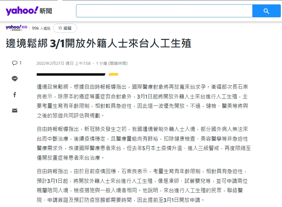 台灣衛福部次長表示,3月起將放寬國際醫療對象,預計3月1號起開放外籍患者來台進行人工生殖療程。