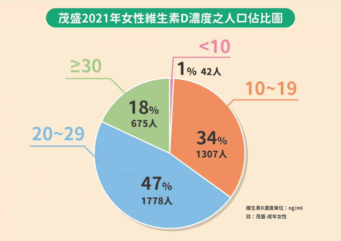 茂盛醫院針對去年度(110年)共3802位成年女性進行統計分析發現:體內維生素D濃度<10ng/ml屬嚴重不足的族群佔1%;維生素D濃度10~19ng/ml屬缺乏者,佔比拉高至34%,合計為35%;至於20~29ng/ml則屬不足者的佔比為最高,超過47%;即維生素D濃度達到正常標準值婦女的佔比卻只有18%。匯整上述數據顯示:維生素D濃度<30ng/ml以下之維生素D不足的族群合計佔比超過82%,即每10位婦女就有超過8位的維生素D是偏低的,這是台灣婦女健康上的一大警訊!