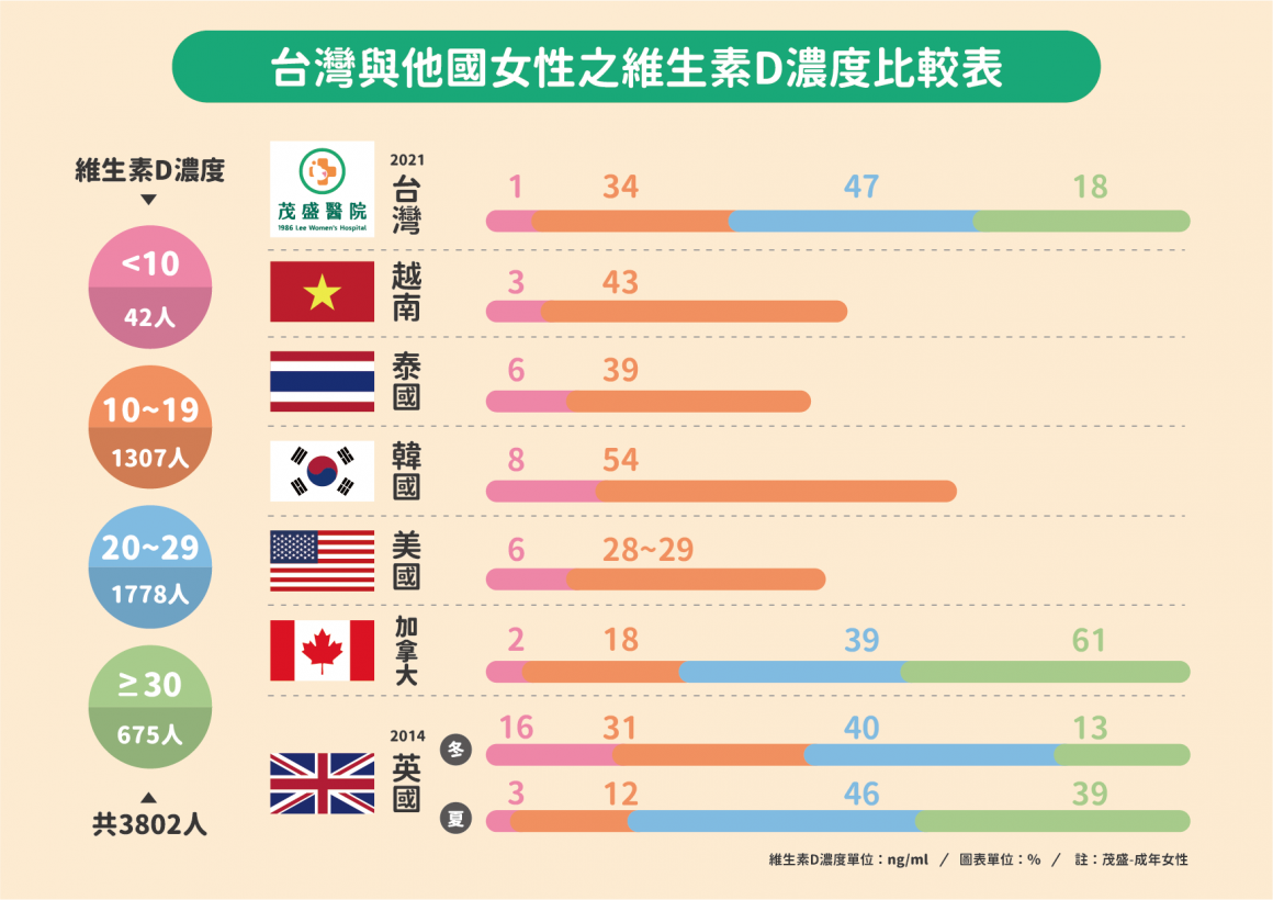 李茂盛院長說明,從本院從3802個案例中發現:體內維生素D濃度<20ng/ml以下的婦女合計佔比竟高達35%,這會影響卵子品質、受孕能力!李院長以衛福部最新的2013-2016年調查報告指出,台灣正值生育年齡女性(19歲至44歲)的維生素D濃度<20ng/ml者佔39.7%,與越南、泰國…等日照高的東南亞國家相比是接近的;但再對照美國、加拿大、英國等先進國家,其婦女維生素D濃度卻比台灣要高出許多(註1)。推測可能是這些緯度高、日照少的地區婦女有補充維生素D的習慣才獲得改善。李院長有鑑於臨床上發現極高比例的不孕婦女其維生素D是缺乏的,提醒她們有必要特別補充維生素D。