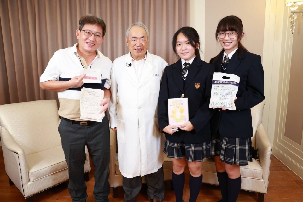 在一次職業訪談的機緣下,讓16年前的試管寶寶高家姊妹子蕎(右2)、子璨(右1)與爸爸(左1),和李茂盛醫師在茂盛醫院相見。(畫面為當事人提供)