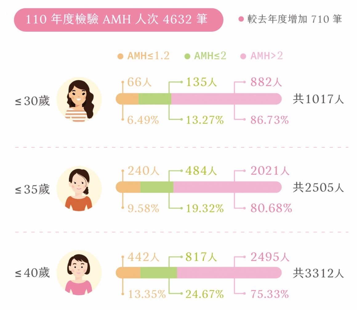 茂盛醫院執行長李俊逸在臨床上就發現,女性的AMH並非固定不變,AMH會因年紀漸長而下降。本院連續2年監測台灣婦女的AMH數值發現:30歲以下者AMH小於1.2,卵子庫存量太低,這族群高達6.49%,表示其生育力很差;而35歲以下也高達15%婦女的AMH過低,等於每6人就有1人屬難孕族群!也就是說, AMH差的不只大齡女子,年輕女性人數也增加了,故醫師提醒求孕婦女要提早檢測,並擬訂符合家庭規劃的治療方針,尤其是想生二胎的婦女,唯有提早佈署才能如願求子。其他相關訊息