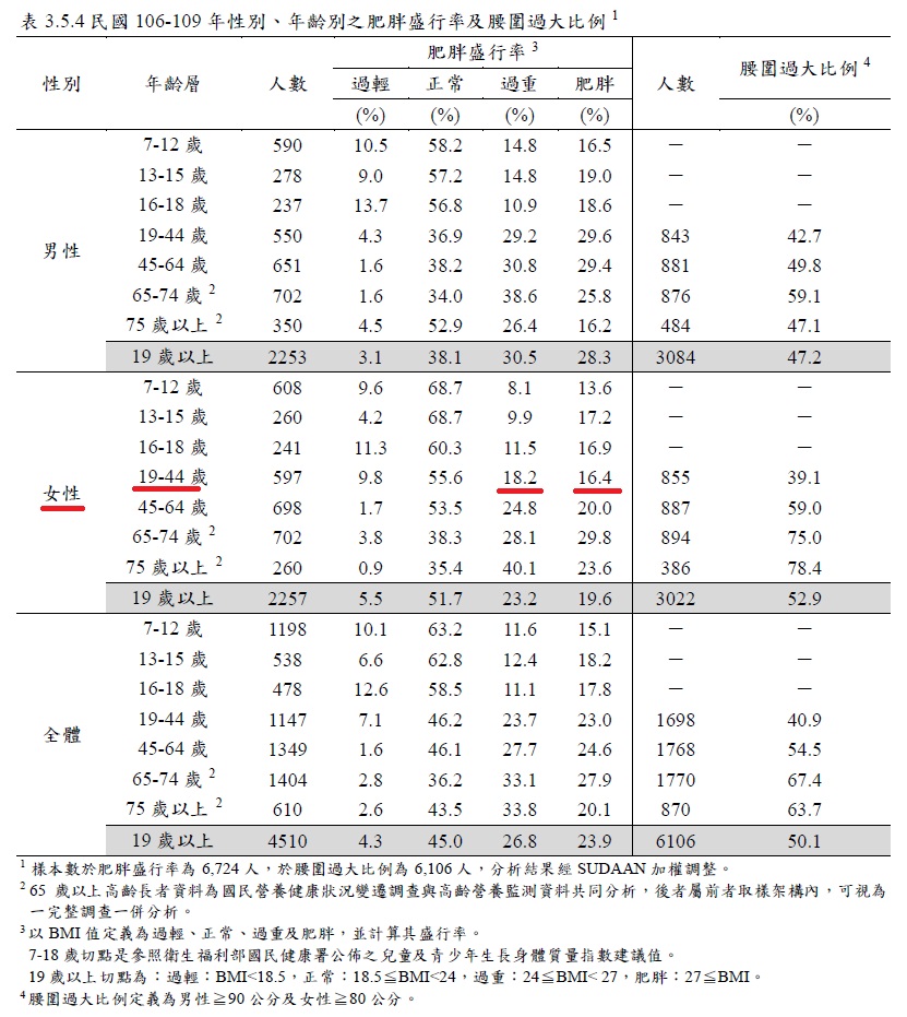 根據國健署公布最新的(106-109年)國民營養健康狀況變遷調查成果報告顯示,台灣育齡女性(19歲至44歲)的平均體脂率(脂肪質)達36.4%(圖1);BMI介於24至27屬過重者有18.2%,大於27以上者屬肥胖者有16.4%,兩者合計者達34.6%(圖2),茂盛醫院家醫科呂昀珊醫師說:「這意味著每3個育齡婦女就有1個人胖子,她們正是難孕族群,這個現象是嚴重的警訊,呼籲體重過重的求孕婦女要正視此問題!」