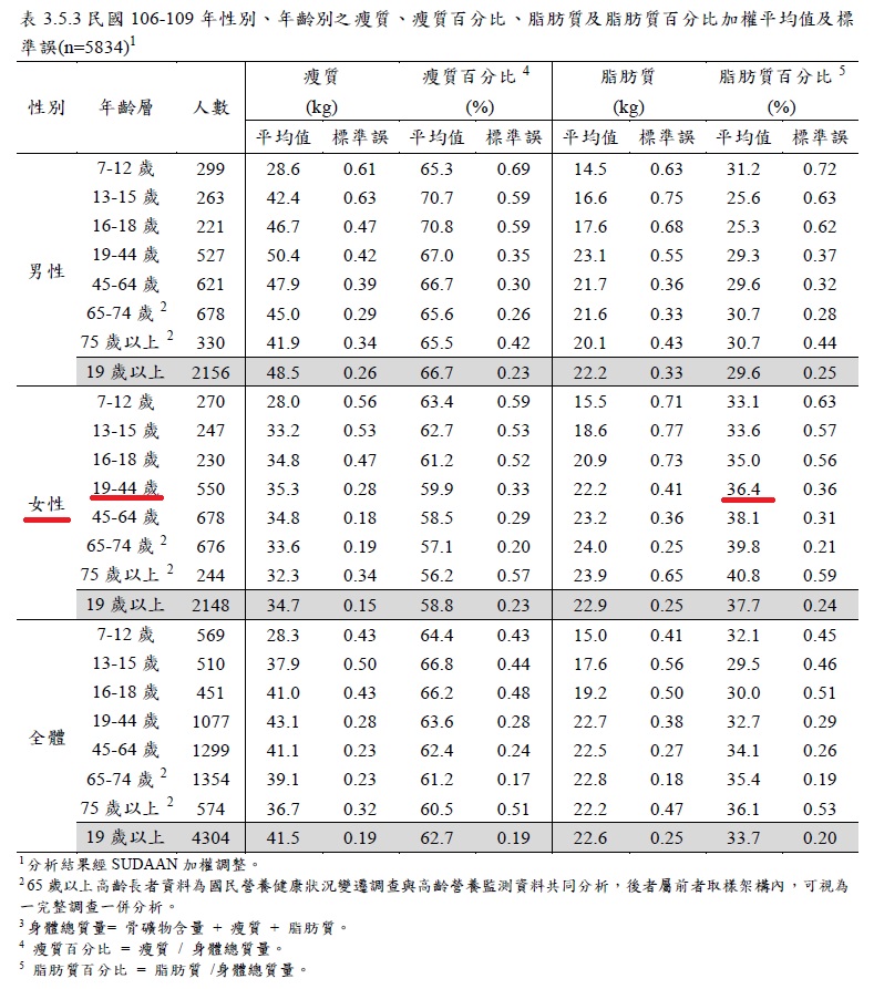 圖一:生育期女性之脂肪質體脂率(脂肪質)百分比為36.4