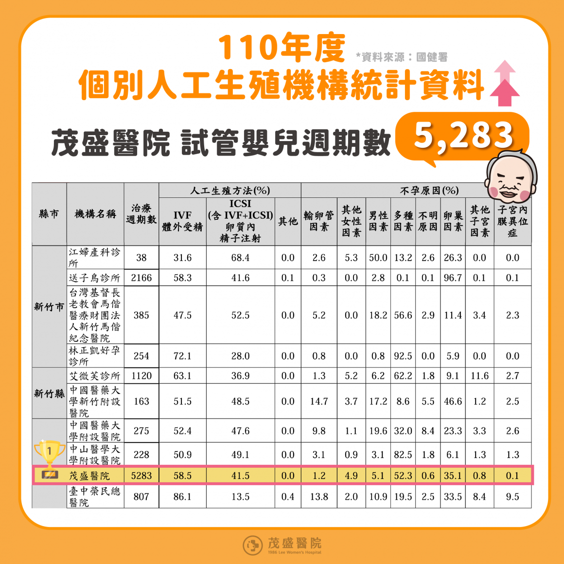茂盛醫院在2021年完成了5,283個試管嬰兒治療週期。全台灣92家人工生殖機構,總共施行49,652試管週期,茂盛醫院佔全國11%。國健署統計,全台接受試管嬰兒治療的懷孕率為22.5%,治療週期活產率為16.6 %。近2年期間茂盛醫院已順利陪伴2,360個家庭順利迎接寶寶的誕生,更創造了高達超過65.1%的整體懷孕率。