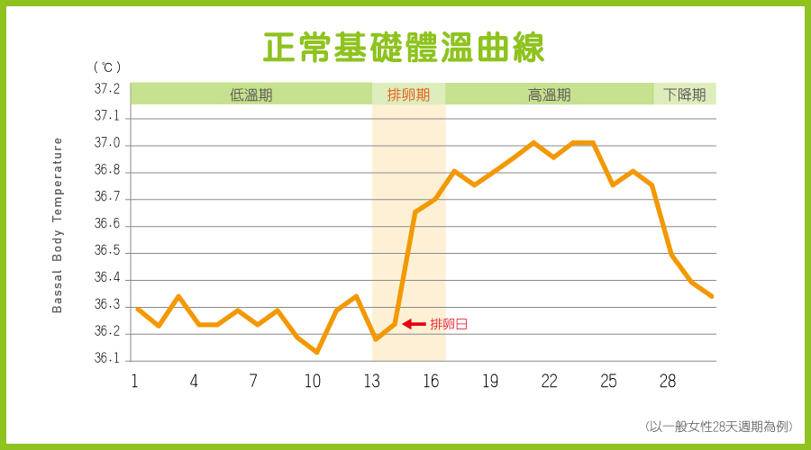 正常情況下,生育年齡婦女的基礎體溫於排卵後,因孕激素刺激體溫中樞的作用,使之略有升高達36.8~37℃,一般排卵期體溫會高於排卵前0.3~0.5℃,在月經前1-2天或月經第1天下降。因此在正常排卵月經周期,每天測得基礎體溫的連線呈雙相曲線(高低溫兩相變化,如下圖"正常基礎體溫曲線")。