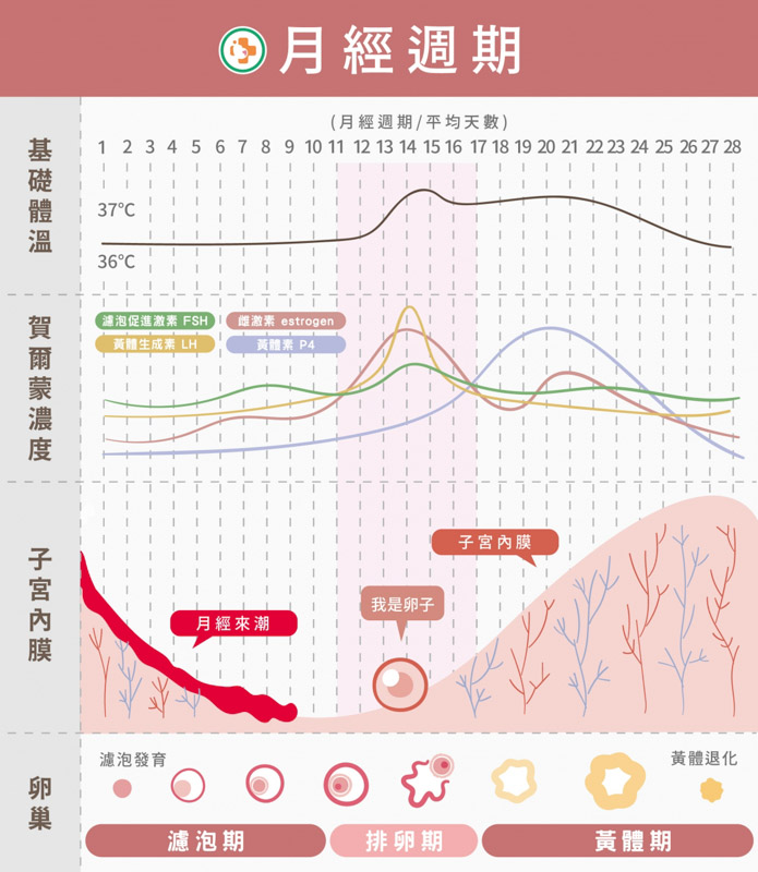 月經週期會經歷濾泡期、排卵期、黃體期和月經期四階段,以下說明以平均月經週期28天為例。