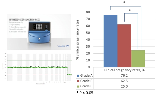 本院根據KIDscoreTM D5模組,將整倍體胚胎依所預測之著床潛能力,由高至低分為A、B、C三個等級。與A級胚胎之形態動力學特徵相比,B級胚胎於早期發育相對較為快速 (tPNf, t2, t3 and t4),於S3 (synchrony in division from 5 to 8 cells , t8 − t5) 則呈現延長的現象,此後發育反而明顯轉慢 (tM, tSB and tB),此形態動力學特徵導致B級胚胎於t120之優良囊胚比率顯著降低。另外一方面,C級胚胎則是於體外培養期間均有發育延遲之現象,而S3與囊胚生成 (tB–tSB) 所須時間亦明顯延長,於是乎於66 hpi ≥ 8細胞期、於115 hpi ≥ 囊胚期與於120 hpi ≥ 優良囊胚之比率均顯著低於A等級者 。