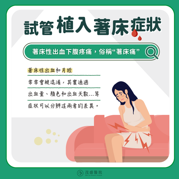 「著床性出血」和「月經」常常會被混淆,其實通過出血量、顏色和出血天數等症狀可以分辨這兩者的差異。著床性出血會伴隨懷孕初期的症狀,例如頻尿、易疲倦、噁心、乳房腫脹,若出現類似試管植入後成功症狀,可安排驗孕。