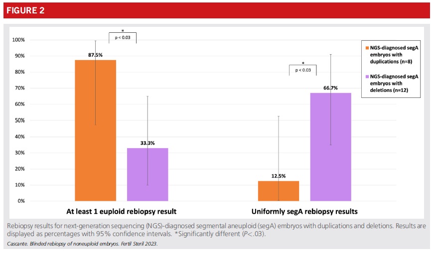 再者,相較於NGS判定之segA染色體片段刪減 (chromosomal delections) 胚胎,segA染色體片段重複(chromosomal duplications) 胚胎於SNP array分析中具至少一次整倍體結果的比率較高 (87.5% vs. 33.3%),以至於SNP array檢測結果一致性顯著降低 (12.5% vs. 66.7%) (P < 0.03, Fig. 2)。
