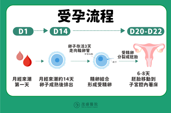 受孕大致上可分為卵子成熟排出(約在月經來潮後約14天)、精卵相遇後受精形成受精卵、受精卵分裂成胚胎、胚胎移動到子宮腔內著床等流程。