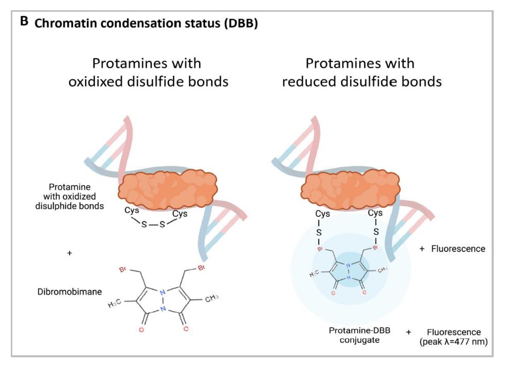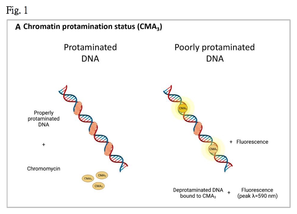 在精子成熟過程中,為了保護父系基因在受精過程中免受侵害,其染色質中的組蛋白(histone)會被精蛋白(protamine)取代,這個過程稱之為「精蛋白化」。此時,精蛋白會通過氧化二硫鍵的連結將精子染色質穩定為環形結構,稱之為「染色質濃縮」(Fig. 1)。本研究針對此染色質結構變化特性進行試驗設計,洗滌過後的精子在第0小時以及培養後第4小時,進行其染色質的檢測與分析。