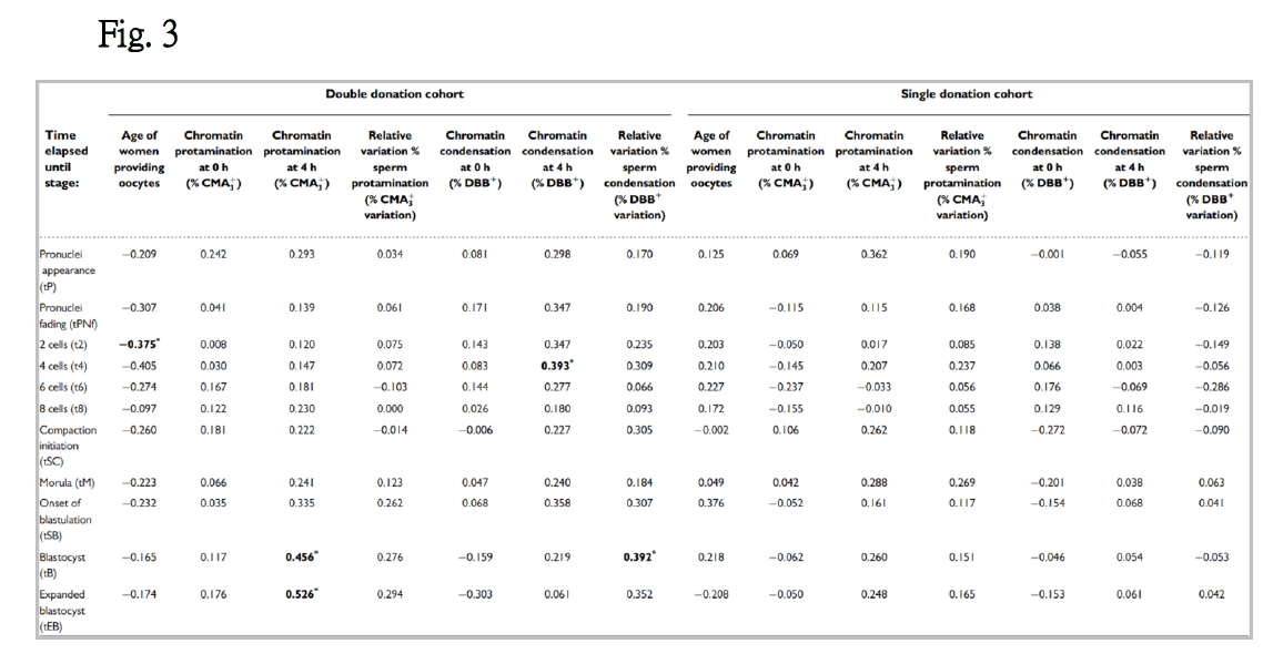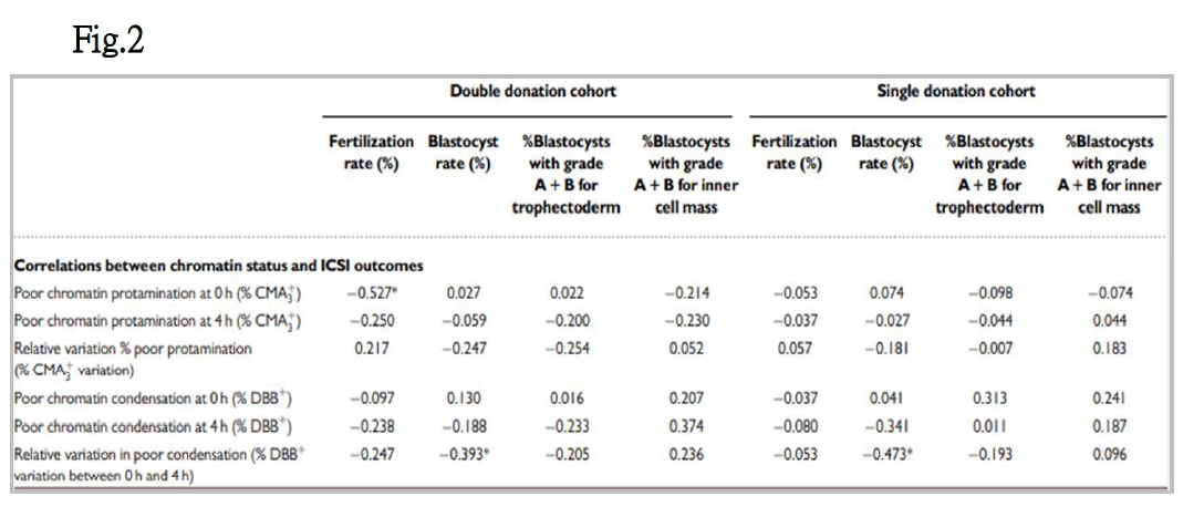 在2022年12月Ribas-Maynou等人於Human Reproduction期刊發表的一篇論文,探討精子染色質精蛋白化(protamination)和濃縮(condensation)缺陷對ICSI臨床結果之影響。該研究為ㄧ篇回顧性研究,利用健康捐贈者的精子進行分組分析,包括精子、卵子均為得自捐贈者(DD組),包括45名精液捐贈者用於55個ICSI週期,總共獲得491個胚胎,每顆胚胎則轉移給一對不孕夫婦用以胚胎移植;另一組為僅精子得自捐贈者(SD組),由34名精液捐贈者用於41個ICSI週期,總共獲得378個胚胎用以移植。