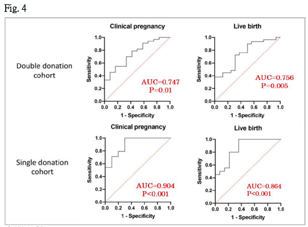 研究結果顯示,經過染色質相關數值的檢測得出精子染色質精蛋白化不佳,對於ICSI週期中的受精率會產生負面影響(Fig. 2);再者利用縮時攝影(time-lapse monitoring, TLM)技術,觀察胚胎發育到達t2、t4、t6、t8、Morula或囊胚的時間(Fig. 3),結果發現:在培養4小時後精子濃縮染色質體外的能力與囊胚率和胚胎發育具有相關性,而且這種關聯性與女性年齡是無關的;結果發現,在DD組別當中在解凍後4小時CMA3數值和胚胎發育至囊胚的時間呈正相關並具有統計上的差異,也就是說當精子染色質精蛋白化能力越差時發育至囊胚的所需時間也就越長;而DBB變異數值和胚胎發育至囊胚的時間呈正相關並具有統計上的差異,也就是說當精子染色時濃縮能力越差時,發育至囊胚的所需時間也就越長。然而這些相關數值和提供卵母細胞的女性年齡無相關性。最後利用邏輯式回歸分析相關參數,並綜合包括精子染色質精蛋白化和濃縮等相關因子,用以預測臨床結果。在DD組別中,預測臨床懷孕的AUC數值為0.747 (P = 0.01),而預測活產的AUC數值為0.756(P <0.005);在SD組別中,預測臨床懷孕的AUC數值為0.904 (P< 0.001),而預測活產的AUC數值為0.864(P< 0.001)。這表示精子染色質精蛋白化和濃縮,與採用ICSI之後的懷孕率和成功活產是有相關性的(Fig. 4)。