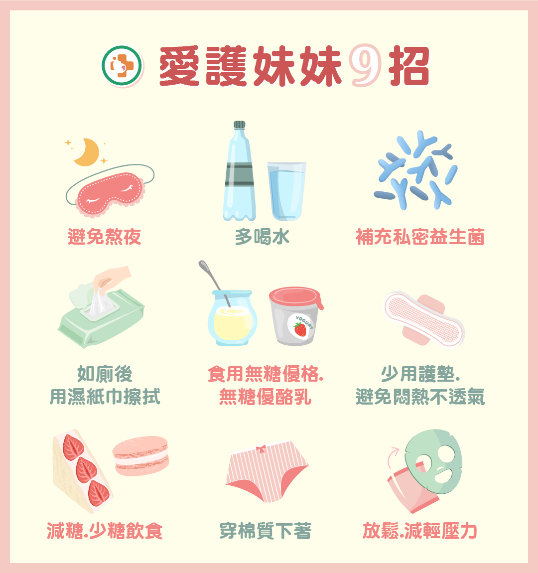 - 穿著棉質下著、減少使用護墊,維持私密處通風,可以降低私密處感染的機率。