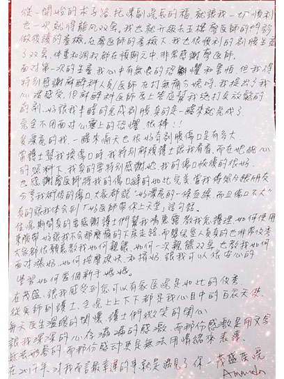 媽媽:「每天醫師溫暖的關懷、護士們開心的微笑,都讓我心中充滿感激,而那份感激是用文字無法形容的,而那份感動更是無法用情緒來表達,在2017,對我而言最幸運的是,就是遇見了你-茂盛醫院」
