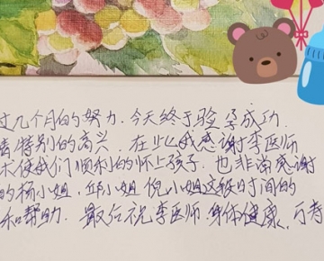 中國福建的藍小姐,有多囊性卵巢,從結婚到準備懷孕已有4年的時間,經當地檢查出輸卵管阻塞,手術後雖已暢通仍然沒有懷孕。在朋友介紹下聽聞茂盛醫院的精湛技術,經李醫師評估後建議施行第三代試管嬰兒,更特地留在台灣驗孕等待好消息,果然兩週後驗孕成功!