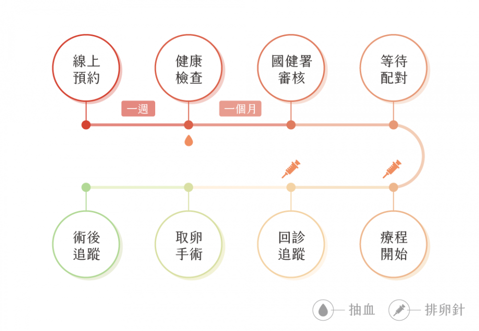 健康檢查報告需要約1週時間完成,院方會將資料送國民健康署審核,大約1個月待國健署回函後進入配對。在諮詢師通知後,即可等月經第3天起進入療程,至取卵手術完成,時間約為2~3週。 - 進入流程後大概多久回診一次?
