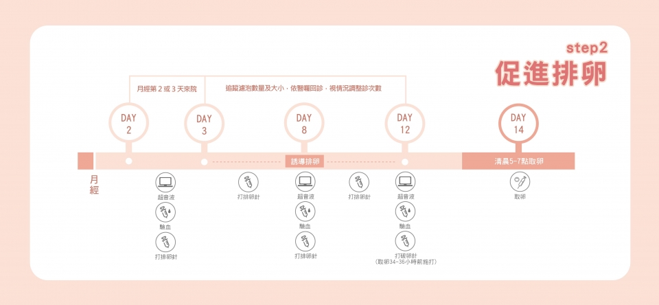 取卵:當濾泡成熟,醫師會開立施打破卵針,打完破卵針36小時內一定要到醫院進行陰道取卵。取卵過程大約10分鐘,為了避免不適,會經由靜脈進行全身麻醉。取卵手術後可在恢復室休息,身體狀況恢復之後可到諮詢室做術後衛教。