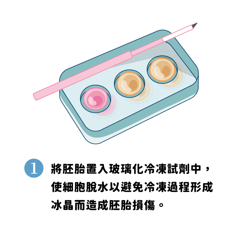 步驟一:將胚胎置入玻璃化冷凍試劑中,使細胞脫水以避免冷凍過程形成冰晶而造成胚胎損傷